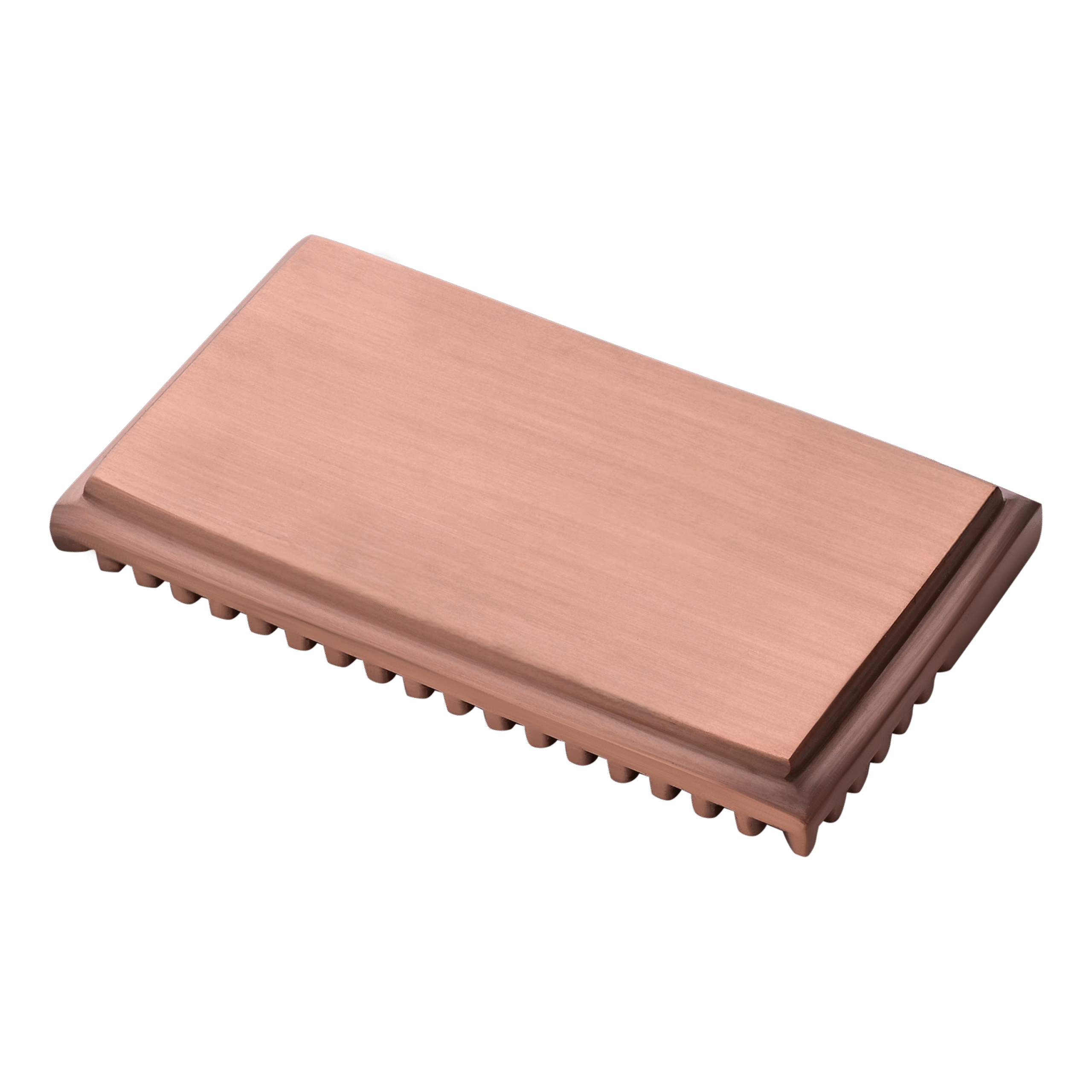 Multiple hand polishing processes are used to create a smooth mirrored surface. The product is then copper plated. Coated with clear Matte lacquer