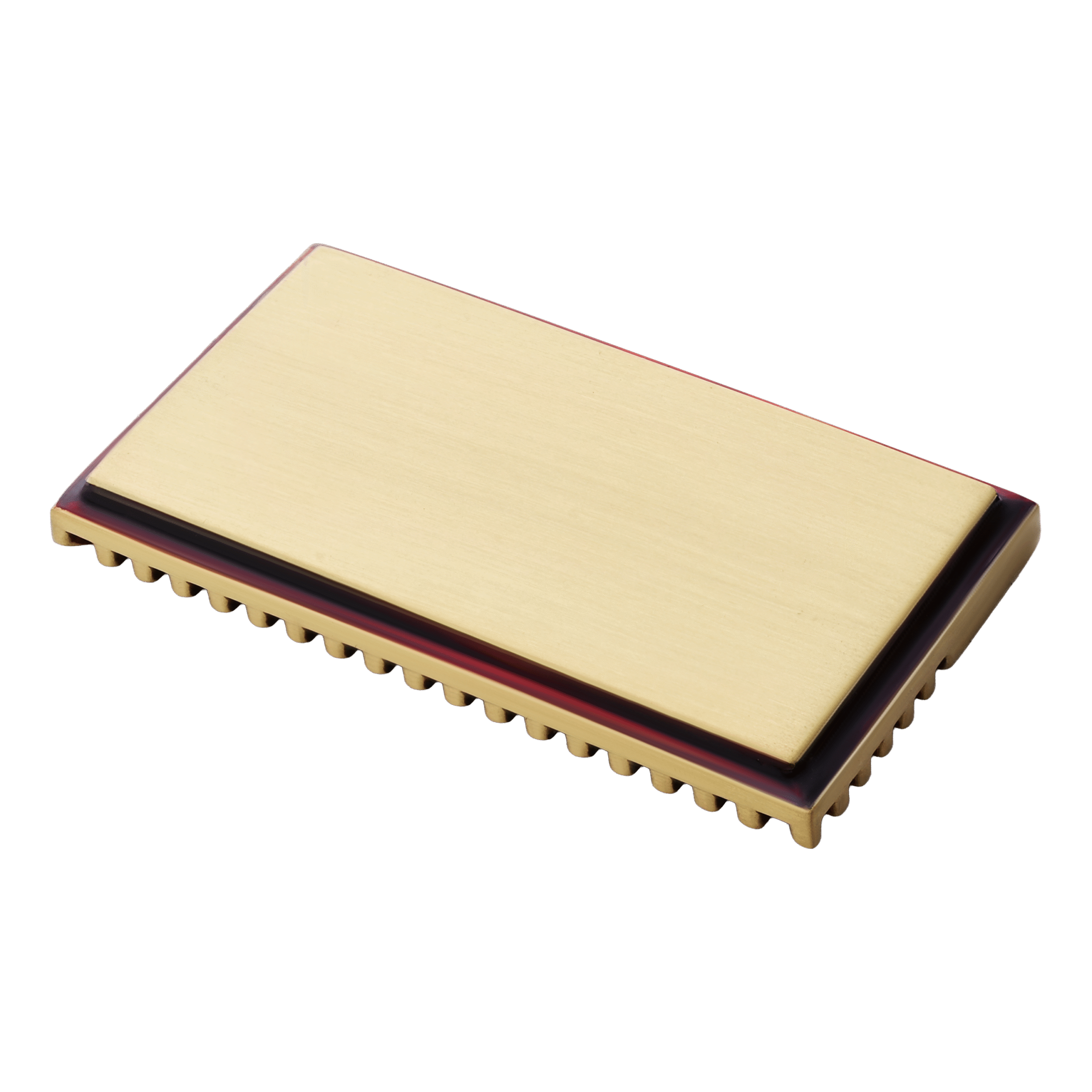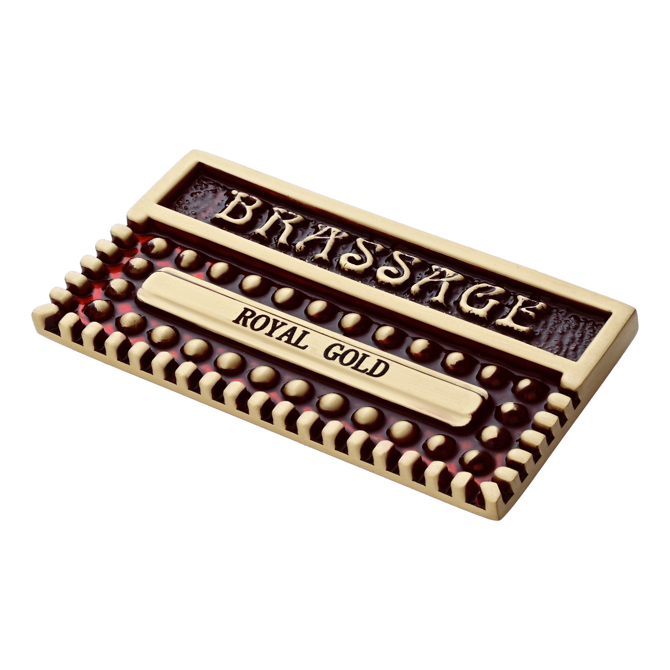 The Polished product is coated with a special varnish which is manually applied by our experienced artisans. The product is then placed in a moisture free chamber to allow the varnish to set in and reveal rich shades of red, a process which takes a few days. Post curing, our polishers selectively hand satin the brass to create our signature Royal Gold finish. Coated with clear gloss lacquer.