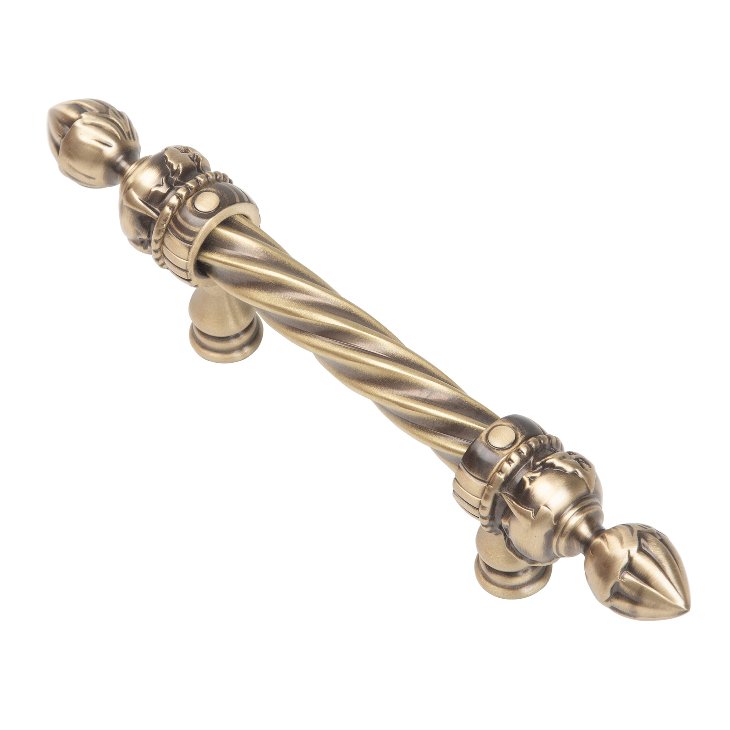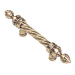 This handle features a richly ornamental design with spiral shafts that reflect artisanal craftsmanship. The sculpted end caps resemble budding domes, adorned with rope motifs and delicate beading that enhance its decorative appeal. Inspired by vintage village aesthetics, it fuses traditional detail with a bold, regal presence.