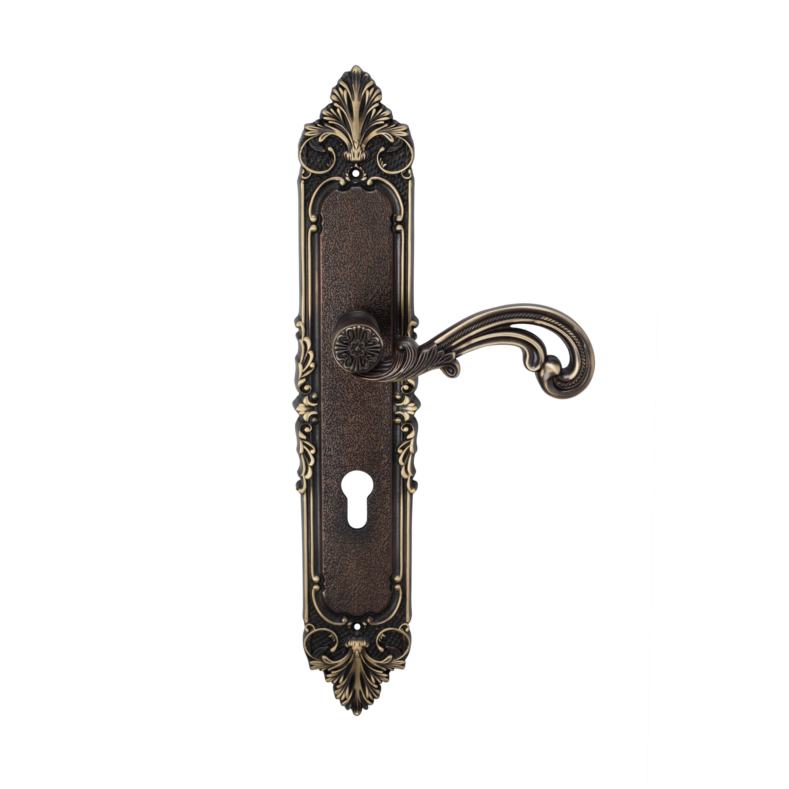 A gracefully scrolled lever featuring fluted detailing and a sculpted profile. Its classical silhouette brings a sense of regal elegance to interiors defined by historical richness and decorative architectural symmetry.