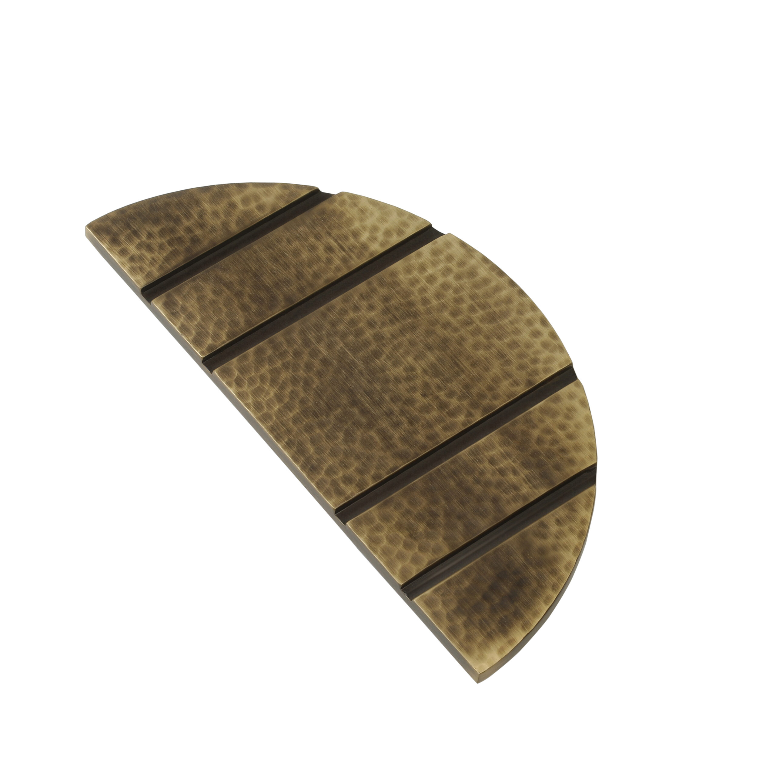 The piece is segmented by clean, evenly spaced linear grooves, introducing rhythm and structure to its surface, It exemplifies a geometric half-moon form, precision-machined with hand-hammered texture that adds tactile richness and artisanal depth