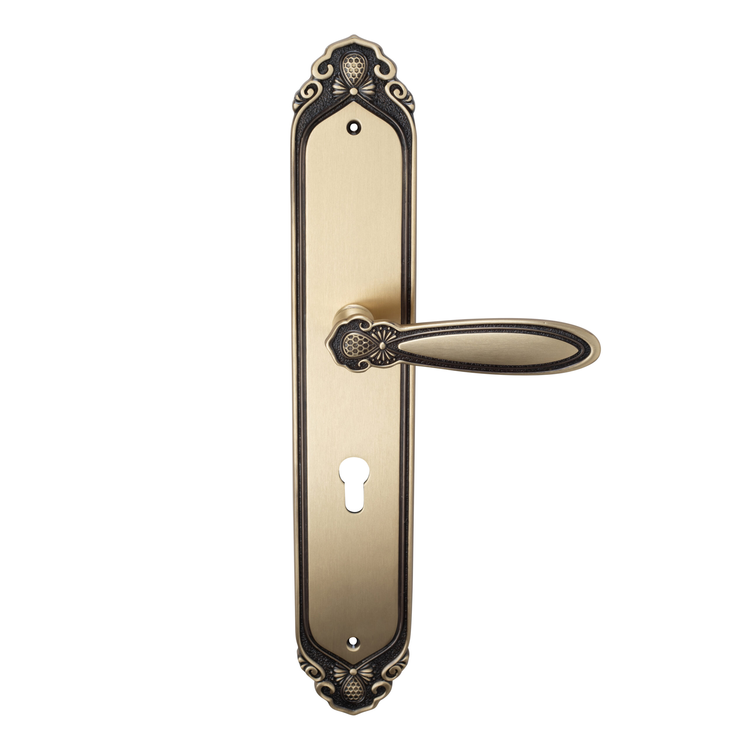 The lever features intricate ornamental detailing with flowing curves and sculpted accents. Its graceful design brings a sense of classic artistry, making it ideal for interiors seeking timeless richness, decorative character, and refined traditional